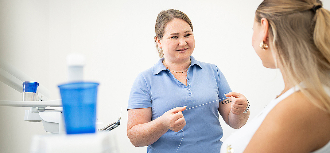 4. Professionelle Reinigung: Entfernung von Plaque und Zahnstein, vor allem in Bereichen, die mit der Zahnbürste nicht erreicht werden.